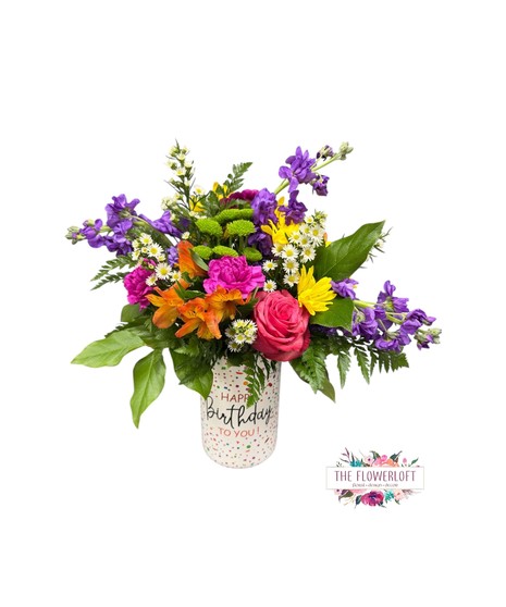 Celebrate their special day with a burst of color! Birthday Confetti Blooms features a joyful mix of vibrant roses, carnations, alstroemeria, daisies, and seasonal accents, artfully arranged in a playful "Happy Birthday" keepsake container. Bright, cheerful, and full of life, this arrangement is the perfect way to send birthday wishes that truly pop.
