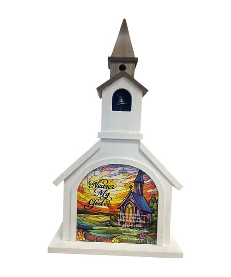 This beautifully crafted wooden church lantern features a charming steeple with a small bell or light (depending on variation) and a stained-glass style window design. The vibrant artwork depicts faith and hope. Perfect for memorial displays, sympathy gifts, or home decor, this piece adds a heartfelt touch of inspiration and light to any space.