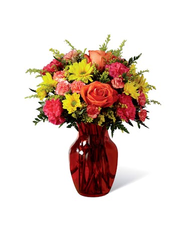 Full of energy and light to help you celebrate with friends and family near and far, this stunning fresh flower arrangement is that perfect gift. Orange roses, yellow daisies, hot pink carnations, orange mini carnations, yellow solidago, and lush greens are arranged beautifully in an eye-catching colored glass vase. A fun way to surprise and delight your recipient in honor of a birthday, or to offer your congratulations wishes!
