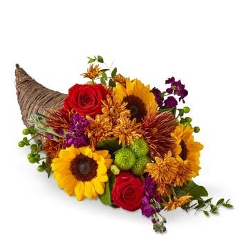 Invite your chosen family around the Friendsgiving Cornucopia filled with bronze cushion poms and red roses to show thanks for the wildly good times – and toast to many more!