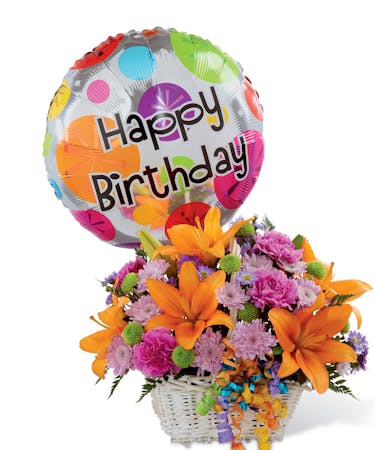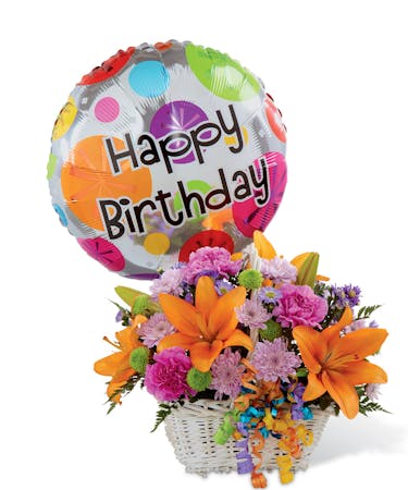 Happy Blooms Basket brings together Asiatic lilies and carnations to create the perfect way to send your happy birthday wishes! Orange Asiatic lilies, lavender chrysanthemums, lavender carnations, purple monte casino asters, green button poms and lush greens are beautifully arranged within a rectangular whitewash willow handled basket accented with colorful curling ribbon. Arriving with a bright Mylar balloon exclaiming, "Happy Birthday," this flower arrangement will add to the celebration of their special day.