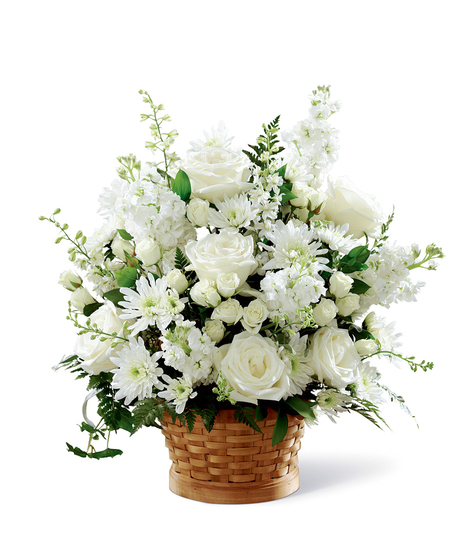Let this exquisite composition of beautiful white blossoms deliver your sympathy and comfort loved ones grieving a loss. The elegance of this arrangement and its warm, homey basket base makes it an appropriate addition to any wake, funeral or graveside service, or to send to the home of family or friends. Handcrafted by a local artisan florist of individually selected white roses, stock, cushion pompons and larkspur set among complementary greens for a memorable bouquet that evokes a tranquil sense of heavenly hope.