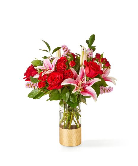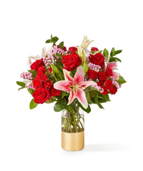 A swoon-worthy bouquet that speaks the language of love, artfully with red roses, lilies, and statice.