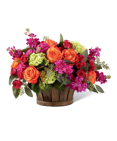 It's a new dawn for a new day, and your recipient is going to rise to meet every expectation with the energy and beauty of this gorgeous flower arrangement by their side. Orange roses capture the essence of the perfect sunrise offset by hot pink spray roses, hot pink carnations, orange carnations, fuchsia gilly flower, green mini hydrangea, seeded eucalyptus, and lush greens situated in a oval stained woodchip basket to give it a natural, rustic, and simply stylish look. A wonderful thank you, birthday, or thinking of you gift!