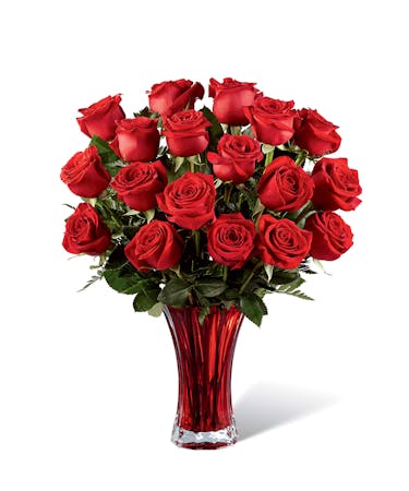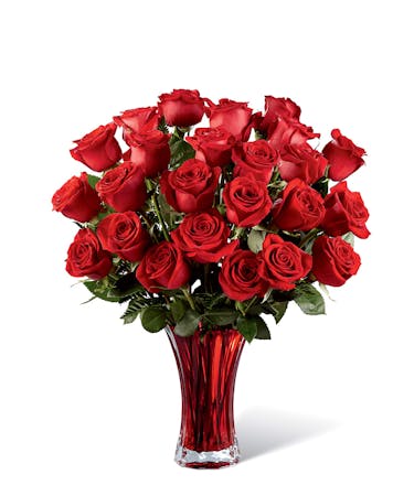 Gorgeous red roses exude pure passion and elegance arranged perfectly within a classic keepsake red glass vase accented with lush greens to add to the vibrant beauty of this unforgettable Valentine's Day bouquet.