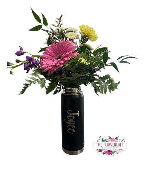 A fun and functional floral gift! Sip & Bloom includes a mix of seasonal flowers arranged in a reusable insulated water bottle. Flower types and colors will vary based on availability, making each piece unique while offering a keepsake they'll use long after the flowers are gone. Add a personalized name for that extra special touch!