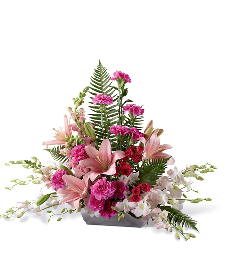 This beautiful, blushing tribute to a life well-lived is an excellent choice for expressing your sympathy in a color palette that reflects the taste of the deceased. Handcrafted in gorgeous shades of pink from soft-to-saturated by a local artisan florist this lovely arrangement includes roses, carnations, Dendrobium orchids, snapdragons and Asiatic lilies accented with graceful greens in a rectangular bowl. It brings a welcome, refreshing note to the solemnity of wakes and funeral services and is bound to be long remembered and appreciated.