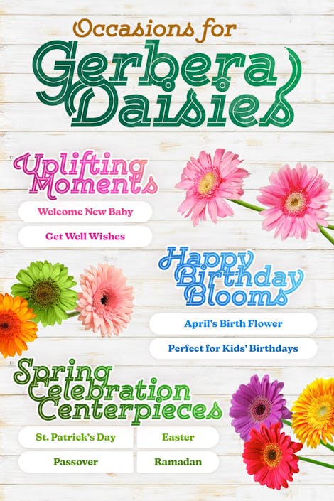 A list of occasions that are perfect for Gerbera daisies like Uplifting Moments, Happy Birthday Blooms, and Spring Celebration Centerpieces. Events: Welcome New Baby, Get Well Wishes, April's Birth Flower, Kids' Birthdays, St. Patrick's Day, Easter, Passover, Ramadan.