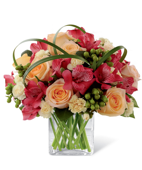 Better Homes and Gardens All Aglow Bouquet. Light up their life with incredible color and blooming beauty when you send this exquisite flower bouquet. Unforgettable peach roses are surrounded by red Peruvian lilies, pale yellow mini carnations, green hypericum berries, lily grass blades and lush greens to create a stunning flower arrangement. Presented in a clear glass cube vase to give it a sophisticated look, this mixed flower bouquet will express your sweetest thank you, get well or congratulations wishes.